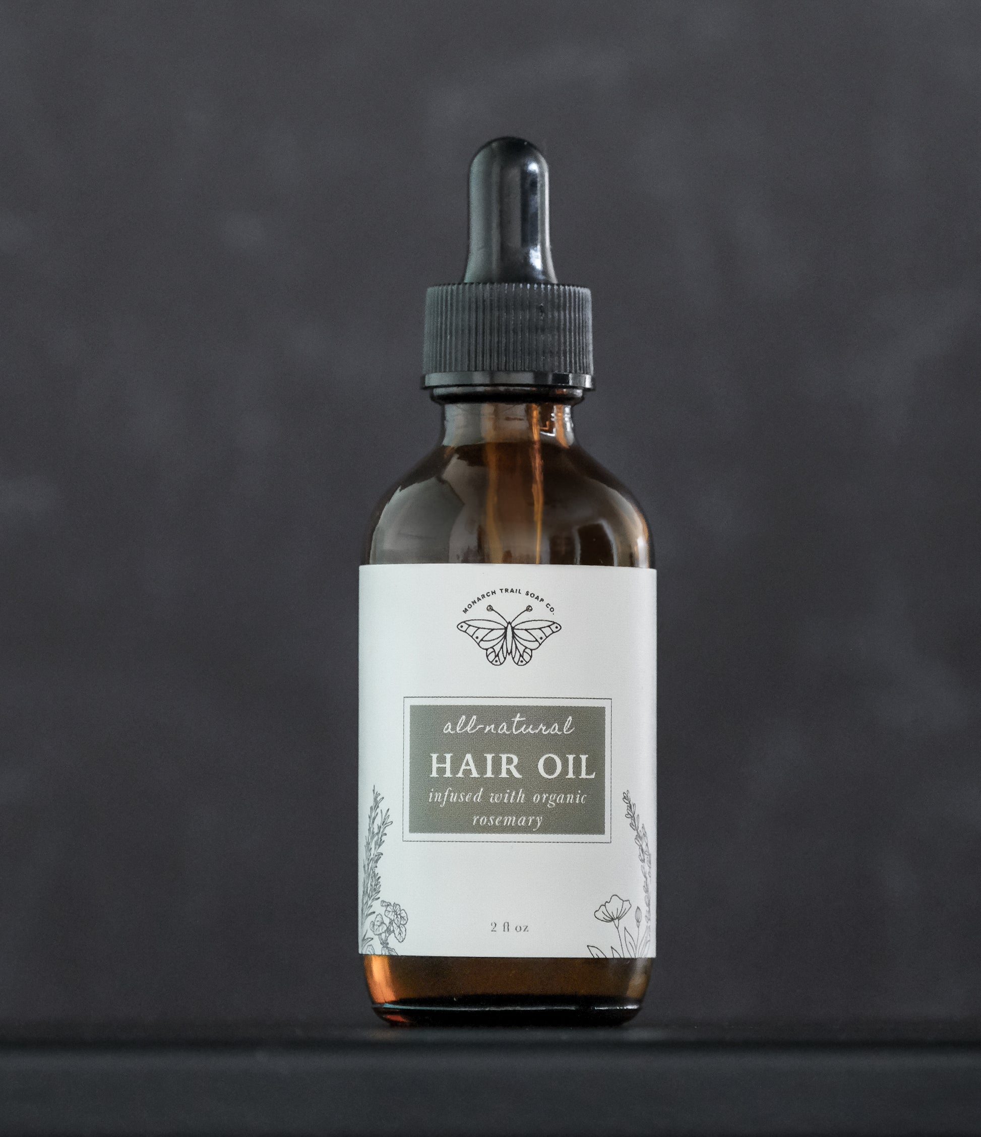 Packaged in an amber glass bottle with glass dropper and 2 oz of hair oil.