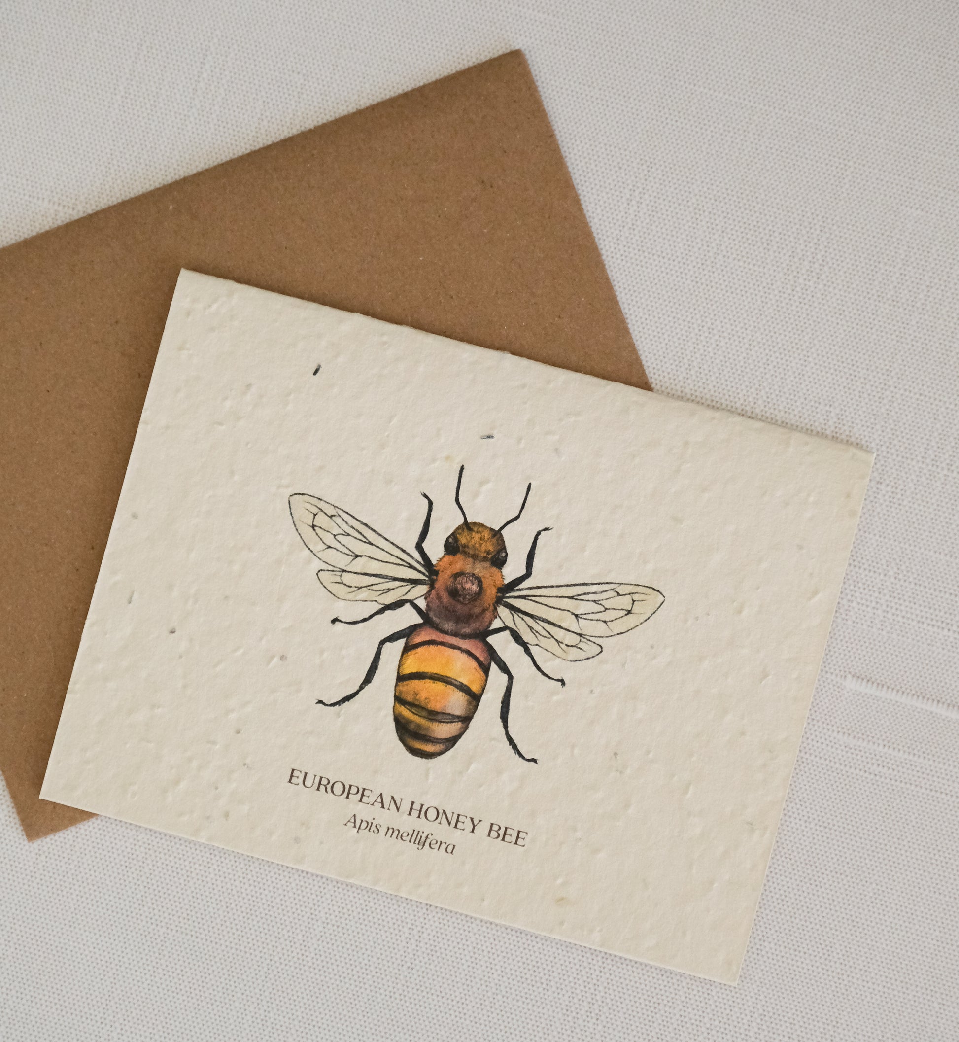 These greeting cards feature our original illustration of a European honey bee (Apis mellifera). They are printed on cream-colored seeded paper made from post-consumer waste. Embedded in this plantable paper is a mix of wildflower seeds: bird’s eye, clarkia, black-eyed Susan, sweet alyssum, catchfly, and snapdragon.