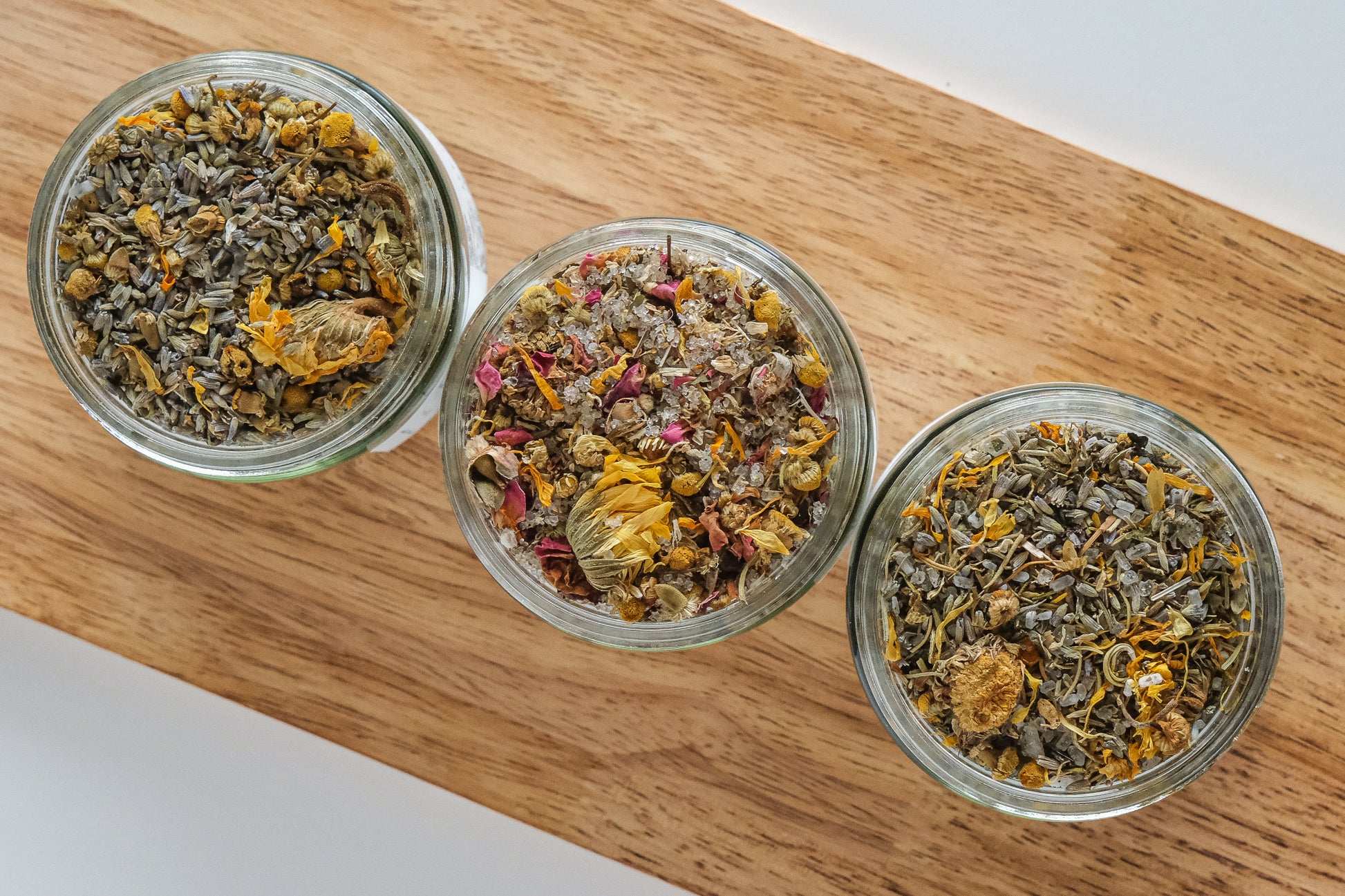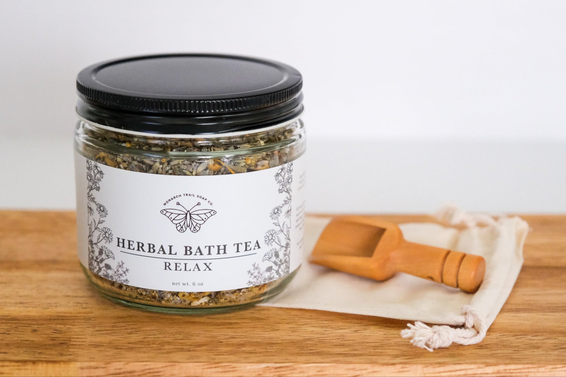Each herbal bath tea is packaged in a glass jar and will include a small wooden scoop and organic muslin bag.