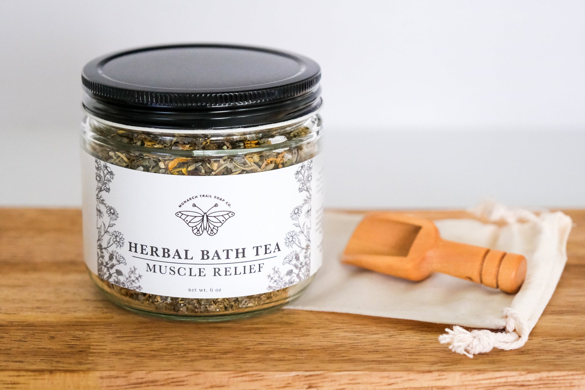 Each herbal bath tea is packaged in a glass jar and will include a small wooden scoop and organic muslin bag.