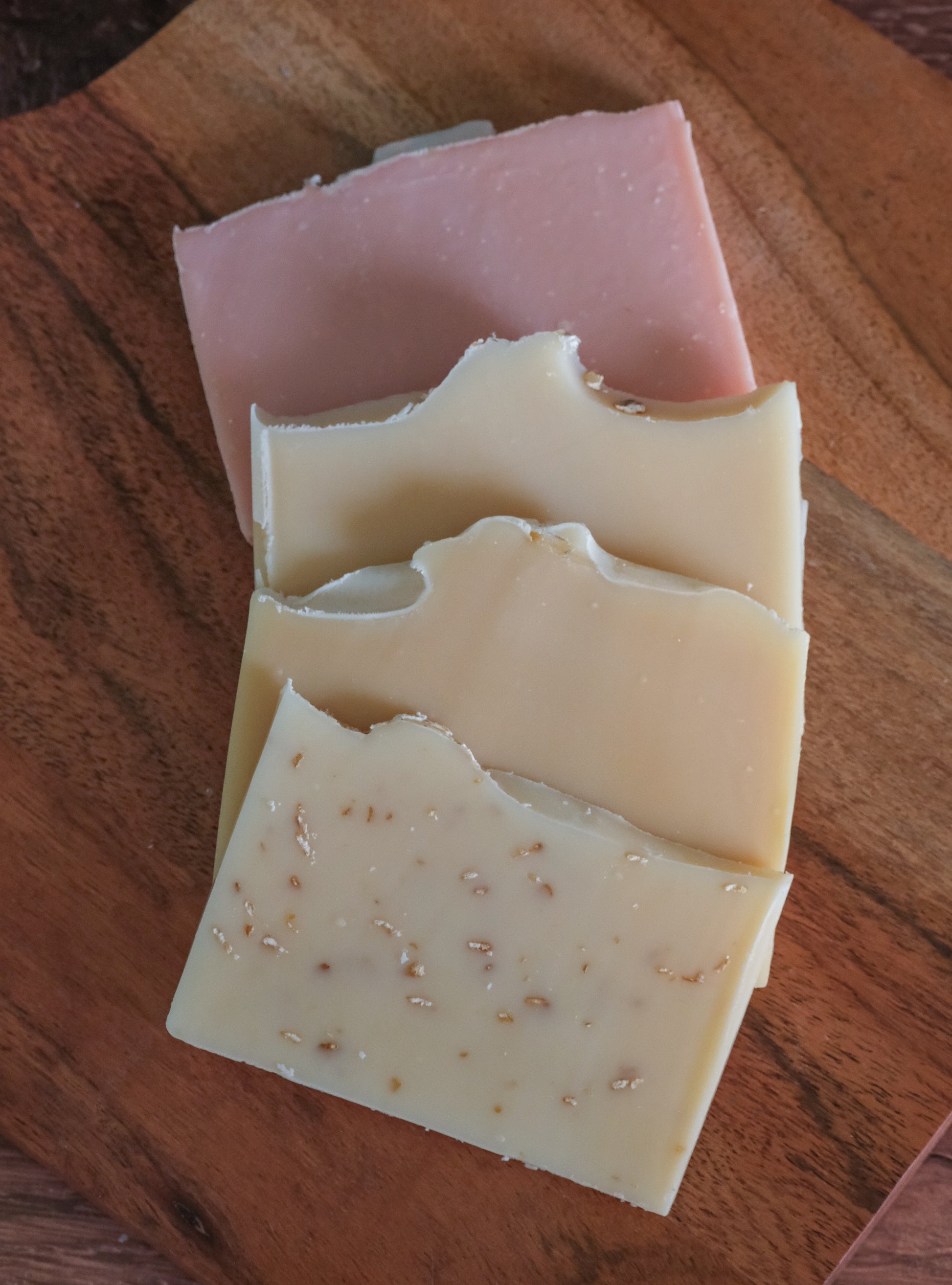 Oatmeal & Honey Goat Milk: Olive Oil, Coconut Oil, Distilled Water, Shea Butter, Sunflower Oil, Fresh Goat Milk, Sodium Hydroxide, Castor Oil, Colloidal Oatmeal, Raw Honey